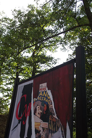 Sur la scène également, un panneau de toiles à la manière de Raymond Haines et Jacques Villeglé. Une superposition d’affiches d’époques différentes pour placer la scène jouée dans une autre perspective : l’oeuvre perdure par-delà la vie de ses créateurs et a sa vie propre.