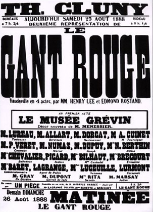 1888 : août : Rostand décide de se lancer corps et âme dans la carrière littéraire, se heurtant farouchement à l’avis de ses parents, et produit lui-même sa première pièce au Théâtre Cluny, co-écrite avec son futur beau-frère, Henry Lee, un vaudeville, Le Gant Rouge, récemment et heureusement retrouvé par Michel Forrier car Rostand s’est évertué, le succès étant là, à en éliminer toute trace d’existence. Rostand s’est considérablement endetté. La pièce, jouée pour la première fois le 24 août, tombe après dix-sept représentations. C’est un échec, Rostand ne veut plus écrire ce type de pièce, veut se consacrer à des sujets plus nobles et manier l’alexandrin. Le Droit et la Sorbonne sont bien loin.